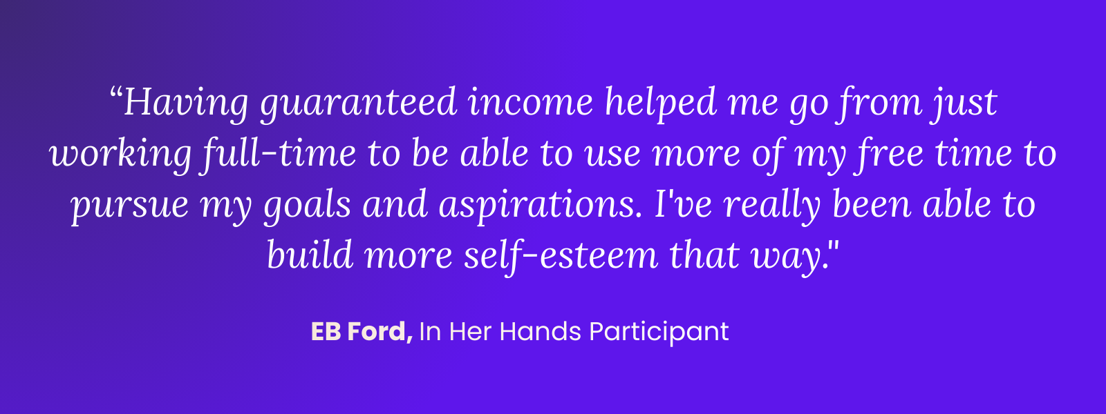 Aisha is a master cosmetologist, mom, and community-minded leader. She applied to the In Her Hands (IHH) program after closing her salon due to a health issue. The guaranteed income provided by IHH helped stabilize Aisha and her family, easing financial pressures and allowing her to look ahead to returning to school and planning her next chapter. Hear from Aisha in her own words.